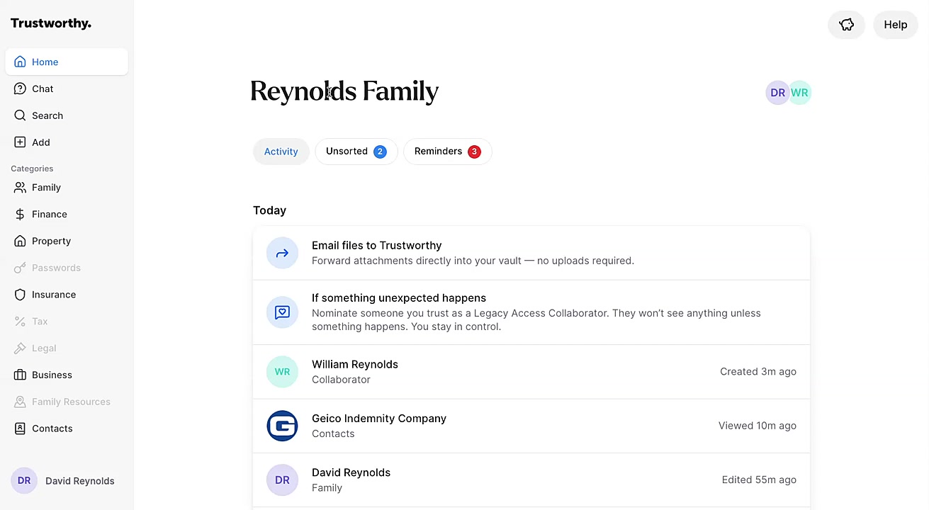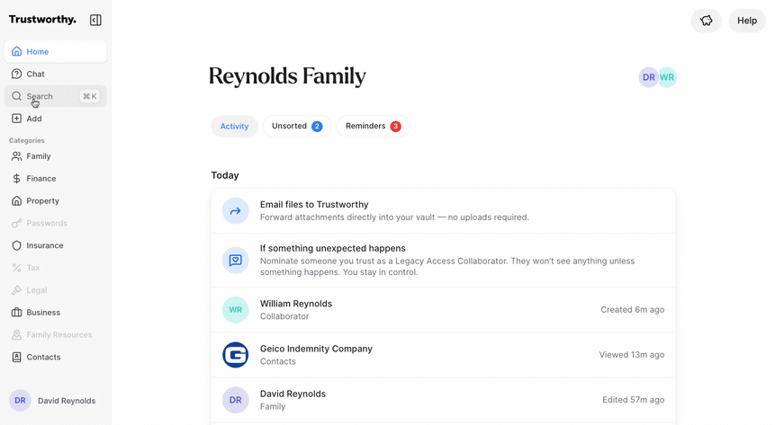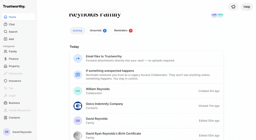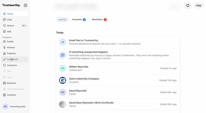 TIP: to keep your account well-organized, make it a habit to regularly check the Unsorted tab to file away new documents and the Reminders tab to stay on top of important dates.