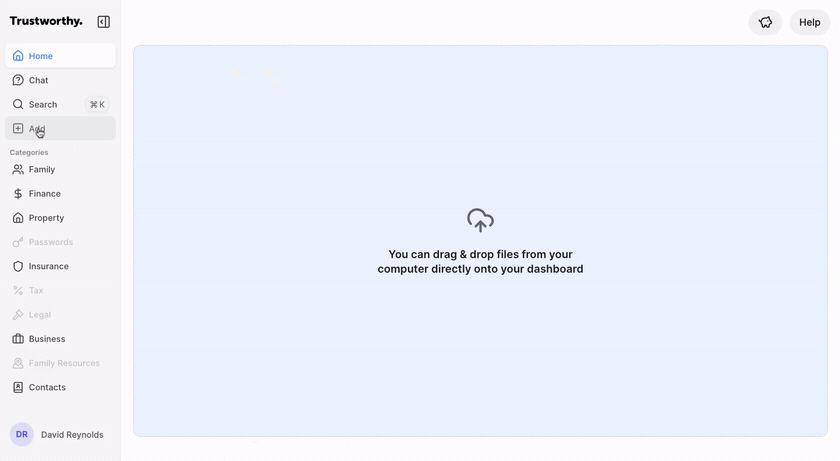 The Trustworthy Dashboard is the central hub for your account, providing a quick overview of recent activity, pending tasks, and upcoming reminders. When you log in, you are brought to this page, which serves as the primary starting point for navigating and managing your information.