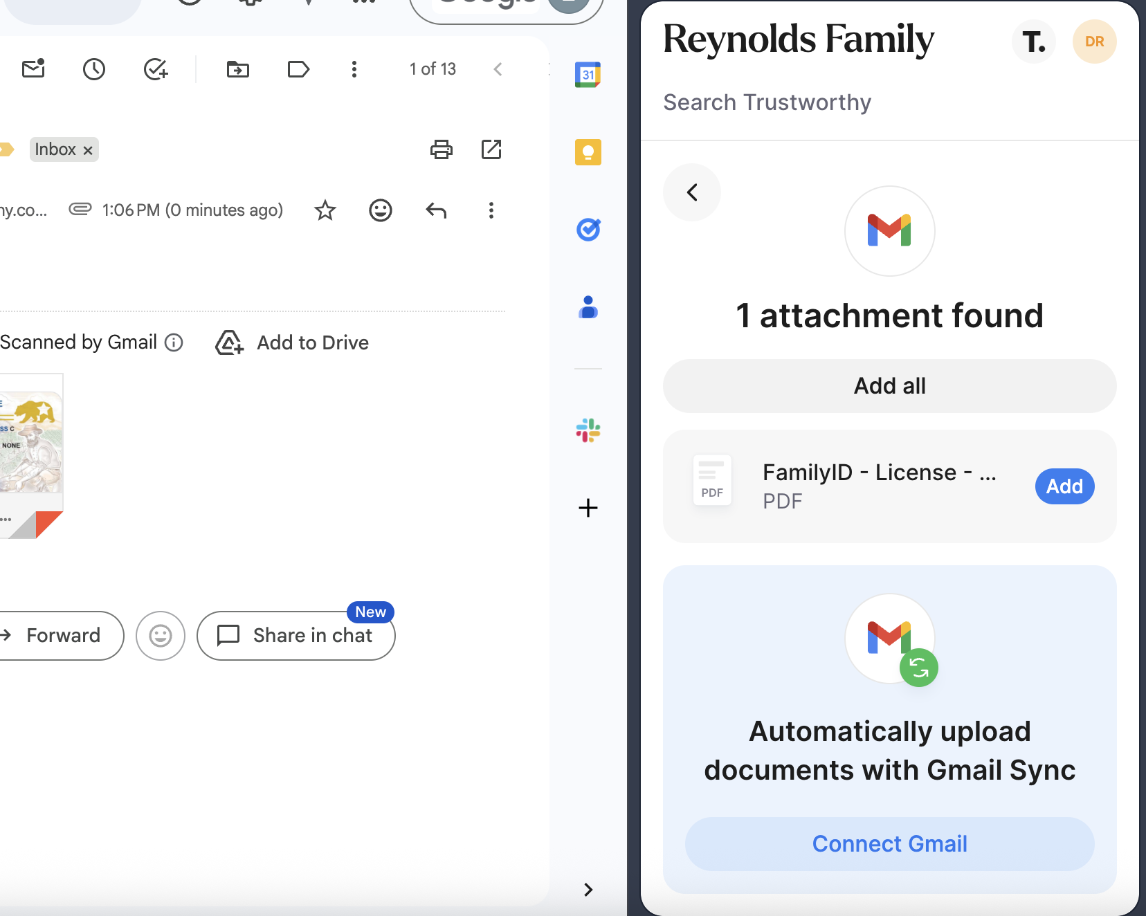 Many people rely on Gmail each day to manage their communications and along with this comes many important files attached to emails. Our browser extension can detect files when you're viewing an email and easily allow you to upload them to Trustworthy.