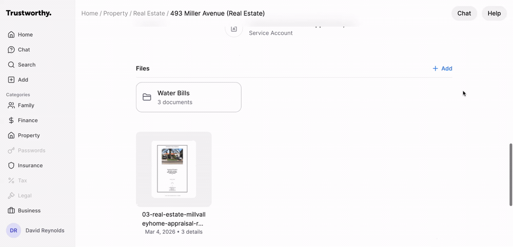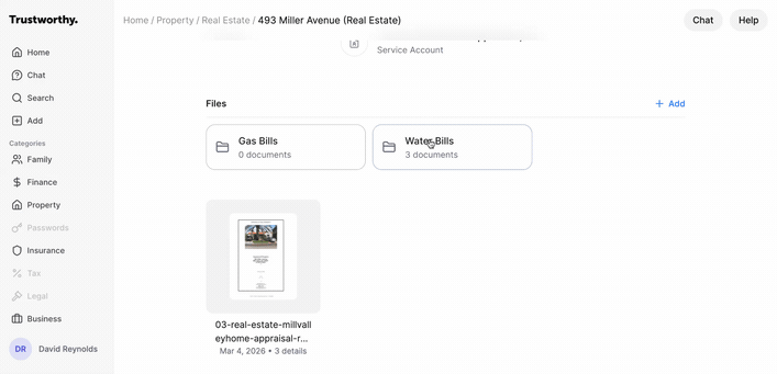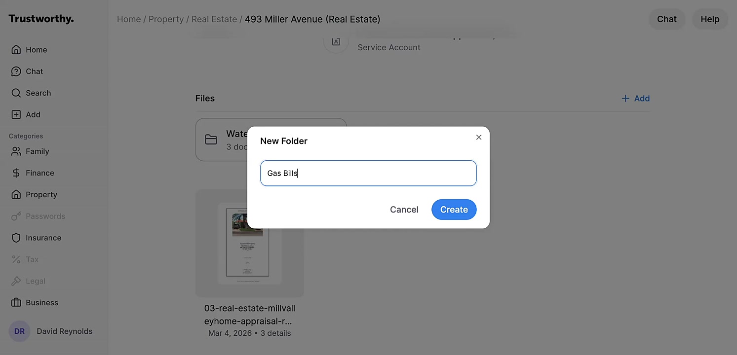Folders provide a simple way to keep your files organized within any item in your Trustworthy account. You can create folders to group related documents, such as utility bills for a property, statements for a financial account, or an inventory for insurance purposes.