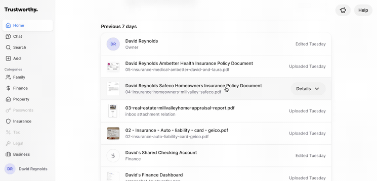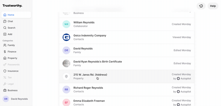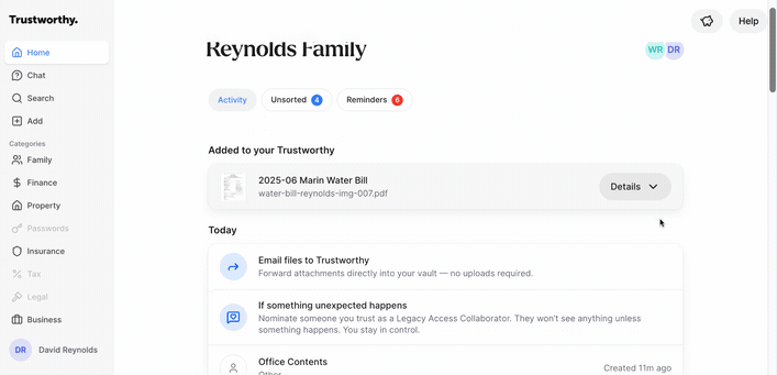 Use the Activity Feed to review all newly created items after performing a bulk upload, such as connecting your Gmail account or forwarding multiple email attachments. This allows you to quickly verify that everything has been categorized correctly and see all the valuable information Trustworthy has organized for you.