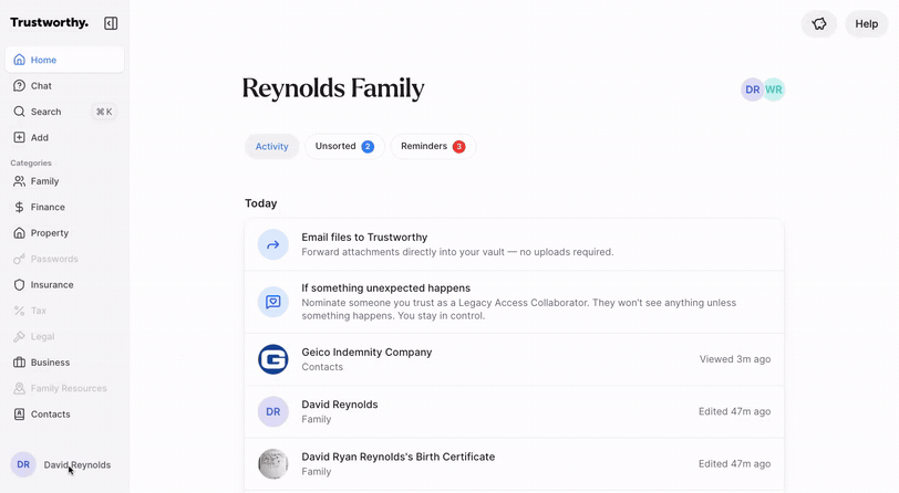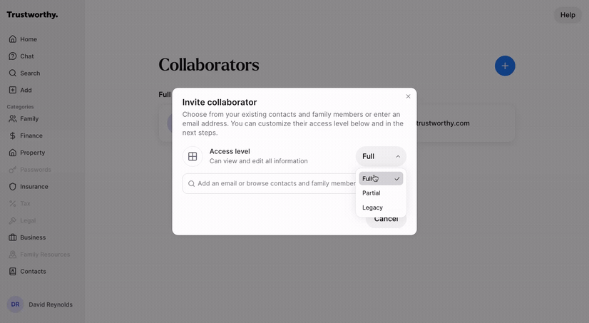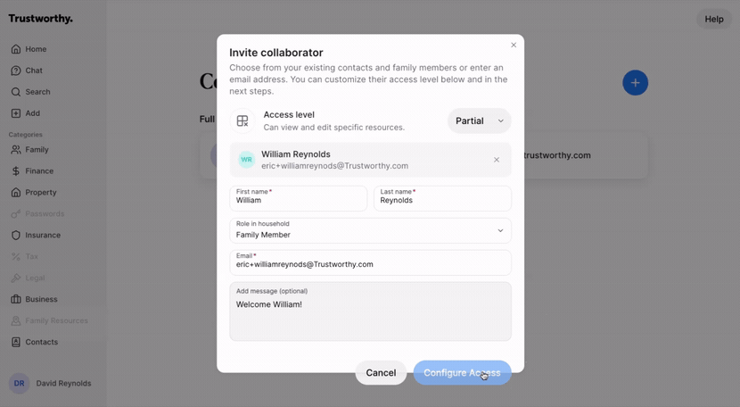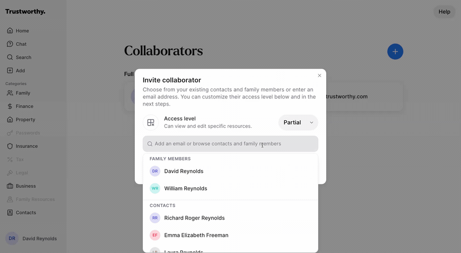 Collaborators are trusted individuals, like family members or financial advisors, who you can invite to help manage your Trustworthy account. This guide shows you how to invite a collaborator and configure their specific access level.