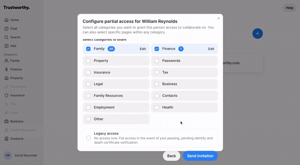 You can also grant Legacy access to a collaborator with partial access by checking the Legacy access box at the bottom. This will give them full access to the entire account upon your passing, in addition to the partial access they have now.