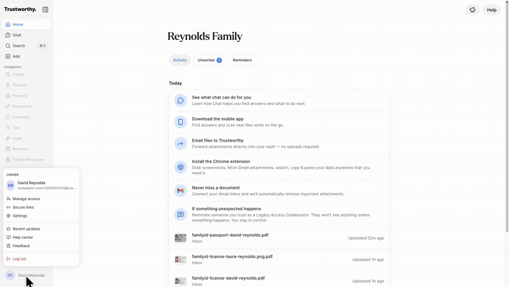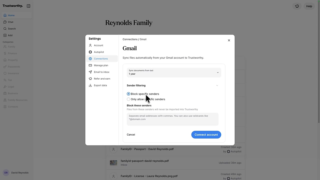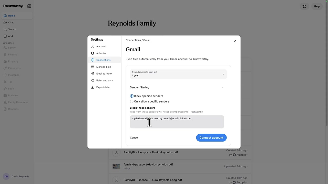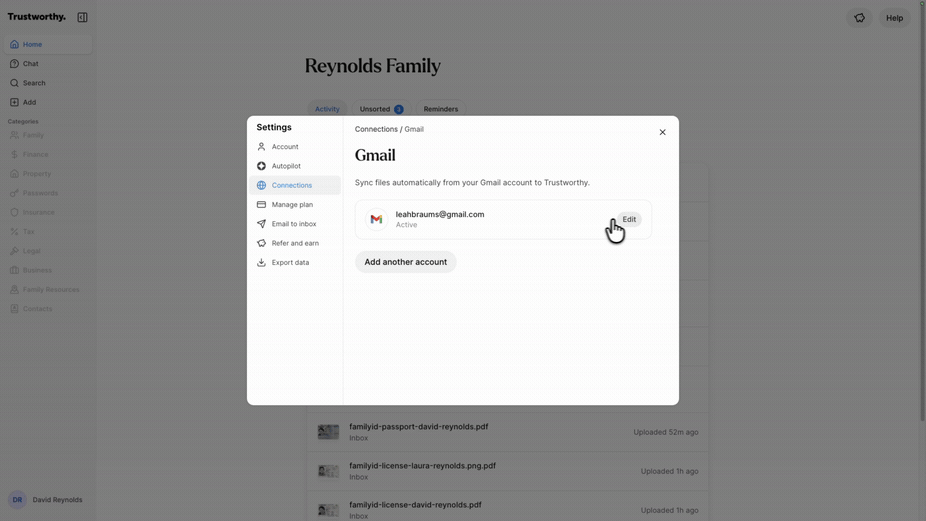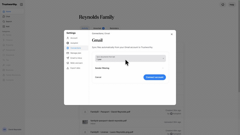 Connect your Gmail account to Trustworthy to automatically find and import important documents directly from your email attachments. This feature saves you from manually searching and uploading files, ensuring your critical information is securely organized in your vault. You can access and manage this connection from your account menu.