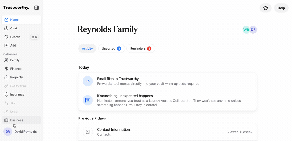 The export will include all of the original documents and files (e.g., PDFs, .csv, etc.) that you have uploaded to your Trustworthy account. At this time, the export will not include data you have typed into text fields, such as notes, reminders, or other details you've manually added to items.