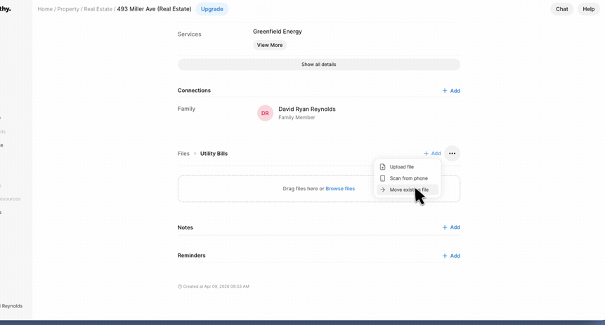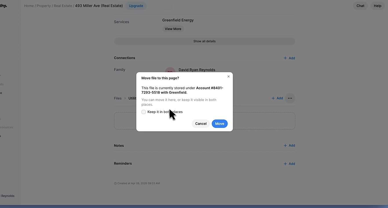 You can add an existing file that appears in any "Files" section to an additional location without removing it from its current location. This is useful for supporting documents that relate to multiple items, like a utility bill for both a property and a utility provider contact.