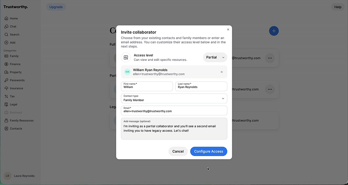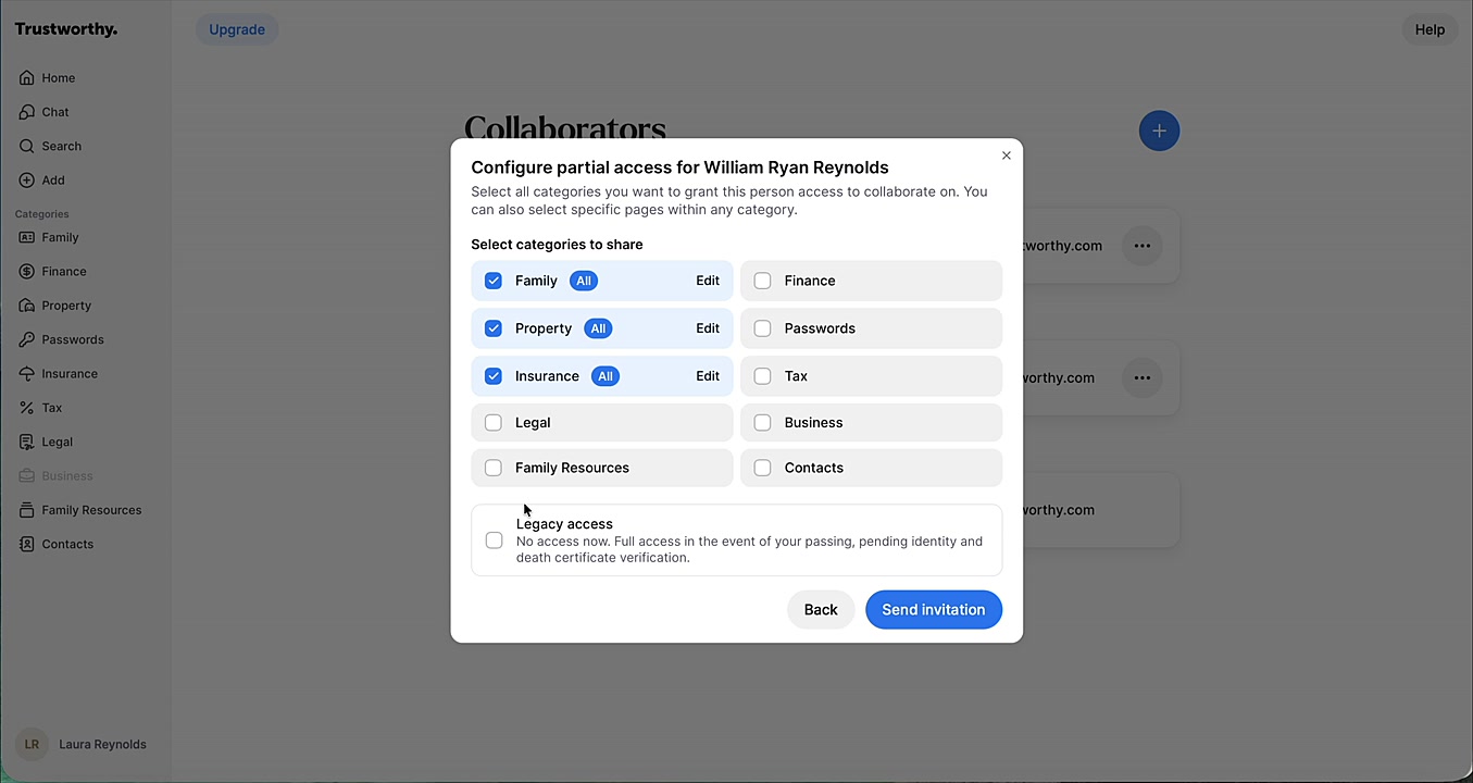 This article explains how to efficiently grant a single collaborator two distinct types of access: partial (or full) and legacy. This dual-permission feature is ideal for trusted individuals, like a family member or an estate planner, allowing them to assist with specific tasks now while also being prepared to manage your full account in the future. The process sends two separate, clear invitations to your collaborator, ensuring they understand and accept both roles.