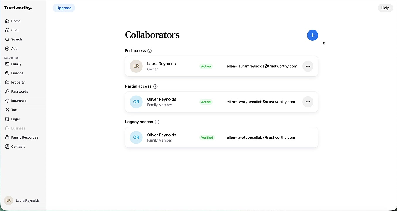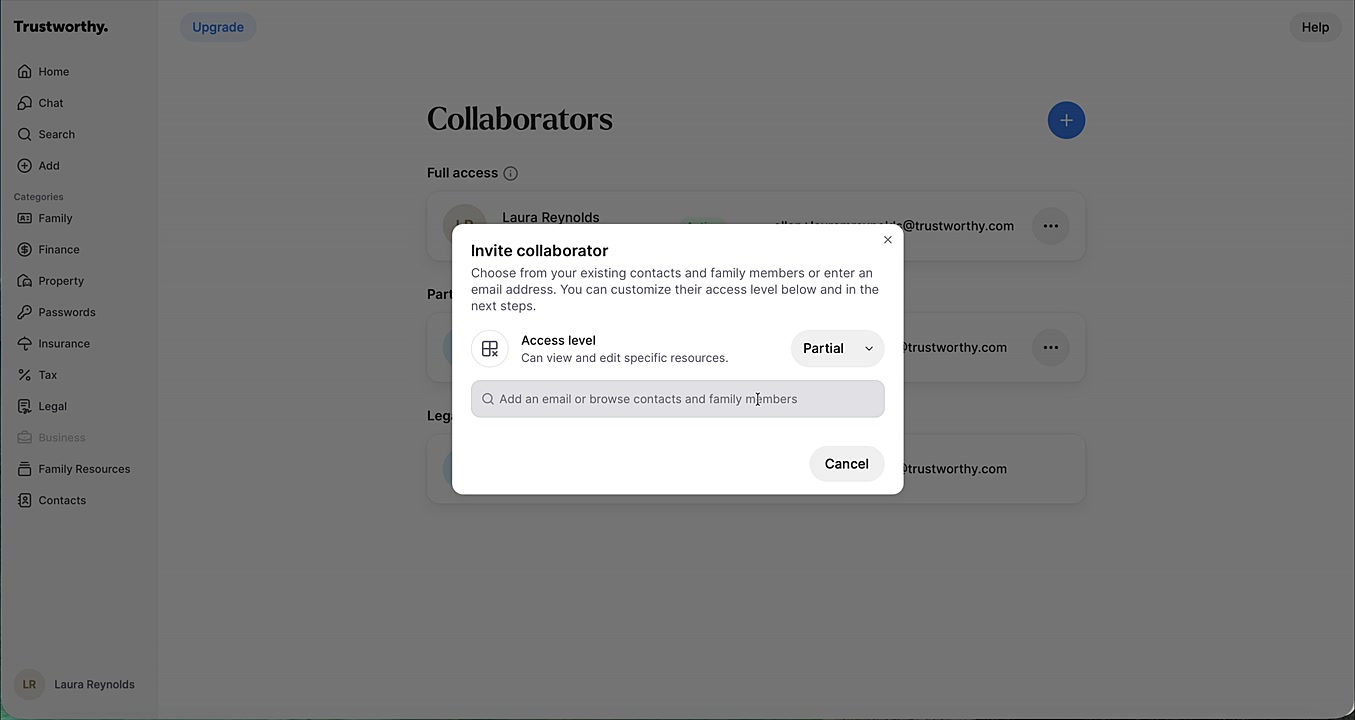 This article shows you how to invite a collaborator and grant them both partial (or full) access for current collaboration and legacy access for future needs. This allows a trusted person to view specific information now, while also being designated to receive full access in the event of your passing. You will need your collaborator's name and email address to complete this process.
