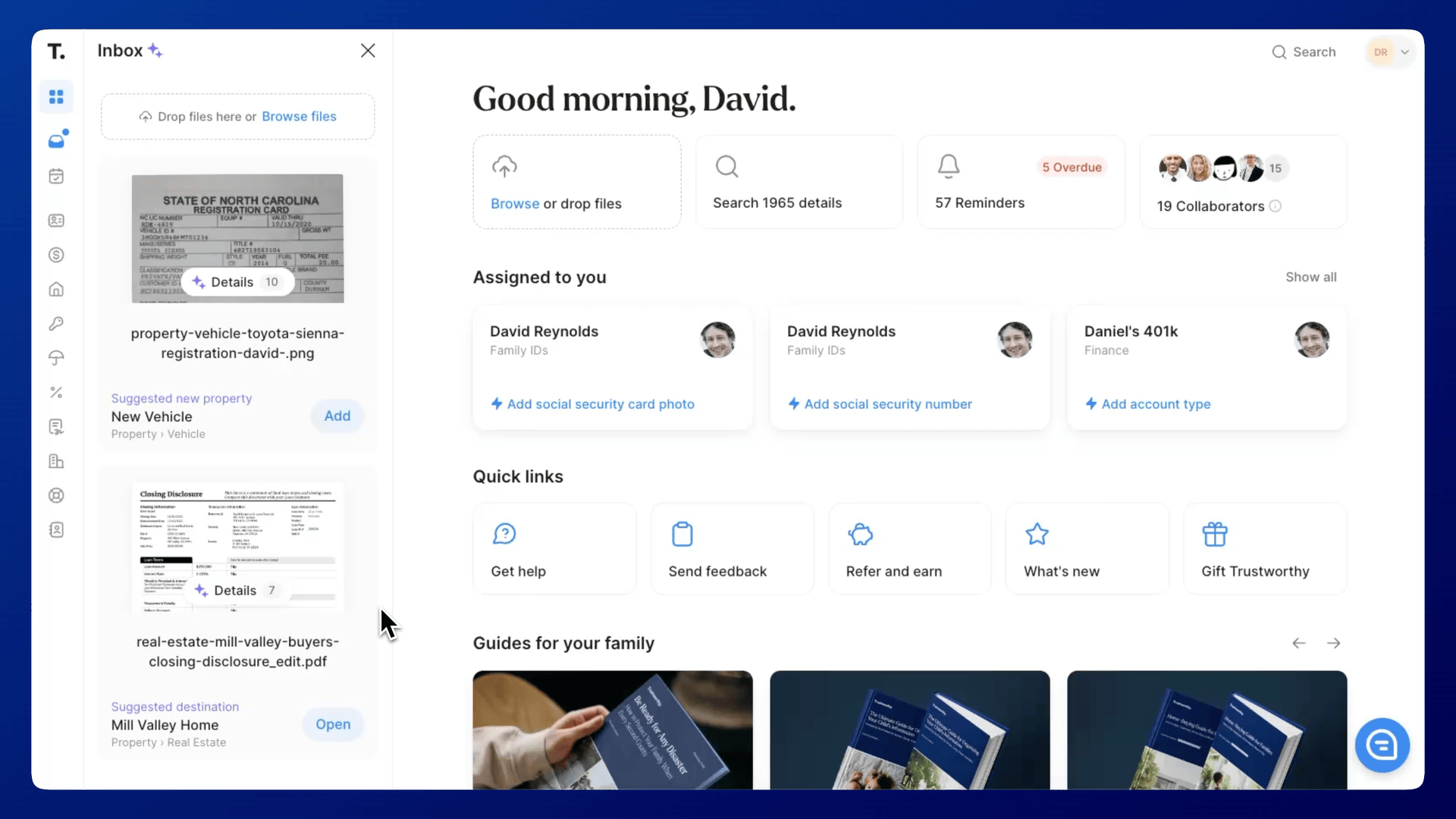 Powered by our groundbreaking Autopilot, this intelligent system not only understands and categorizes household documents but also automatically extracts key metadata and generates concise natural language summaries. It links each document to relevant household entities, suggests appropriate titles, and systematically files them. Put household organization on Autopilot with Trustworthy.