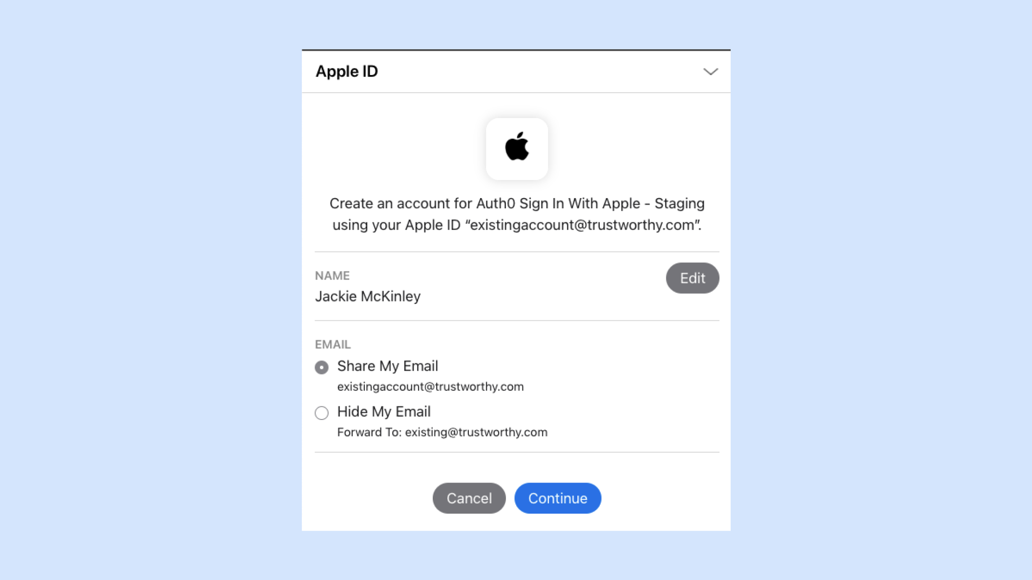 Apple login has a feature called Hide My Email which cannot be used when linking your Apple ID to an existing Trustworthy account. Because we connect your Trustworthy account to Apple via a matching email address, using the hide my email feature could result in sending you into a new account creation flow, instead of linking your account.