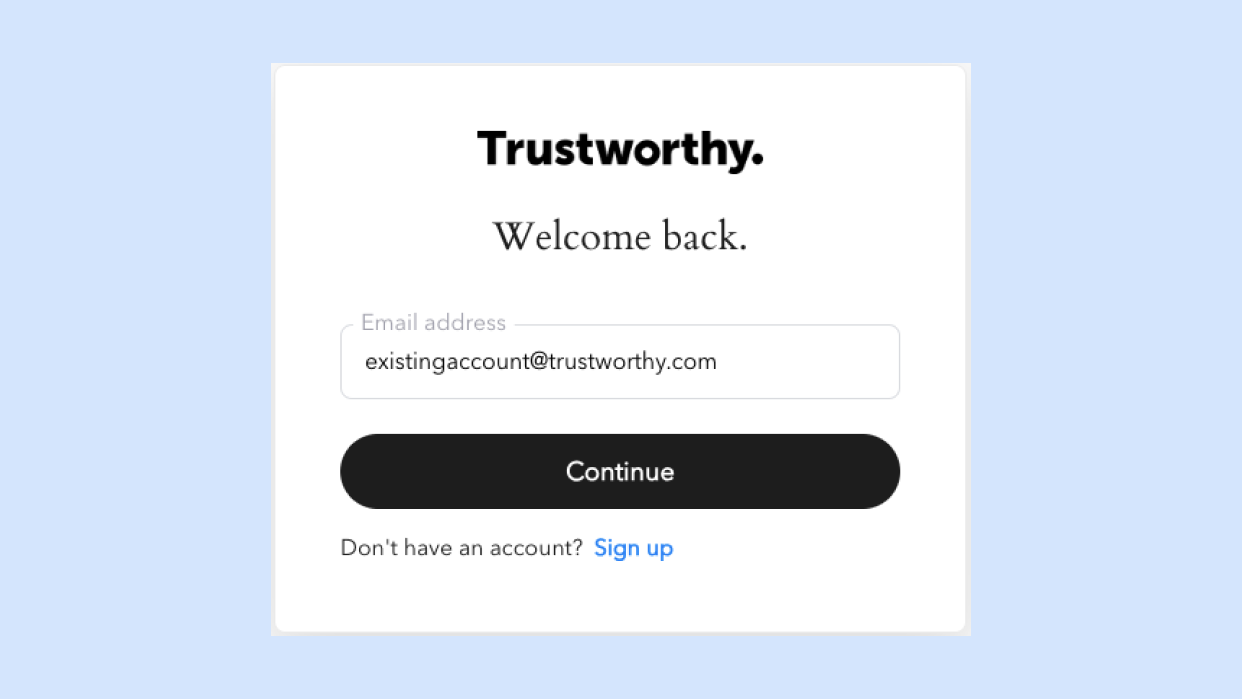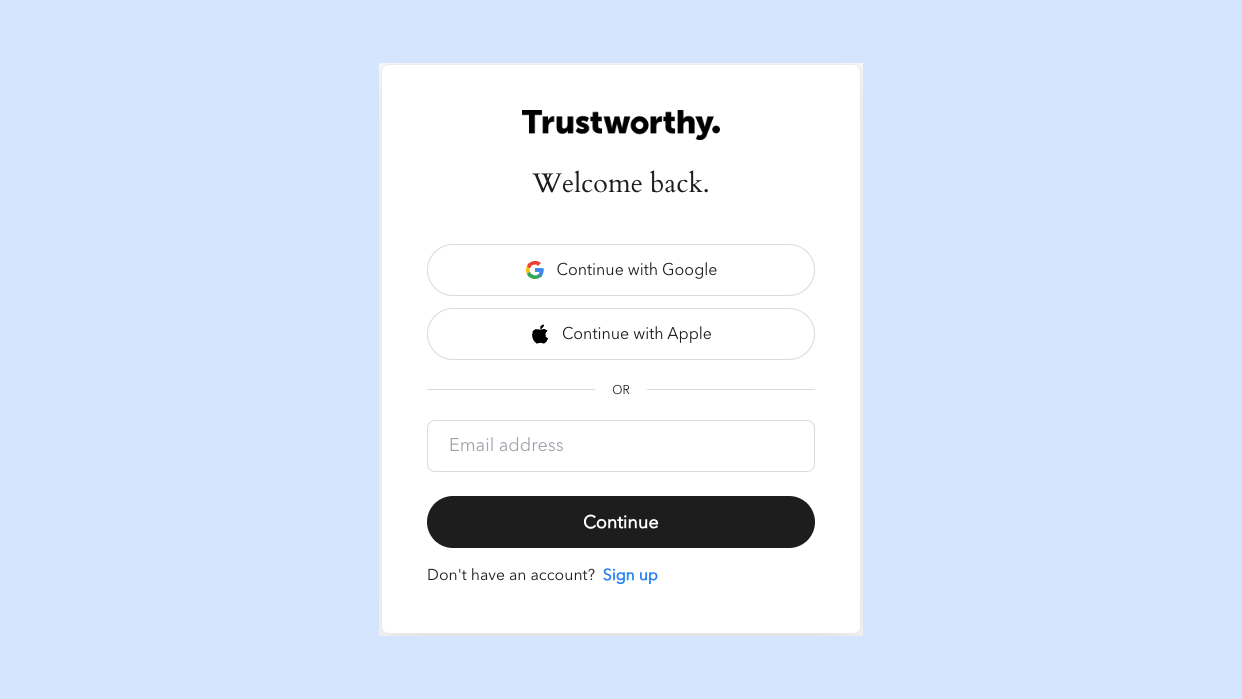 Go to the Trustworthy login page and click Continue with Google or Continue with Apple.